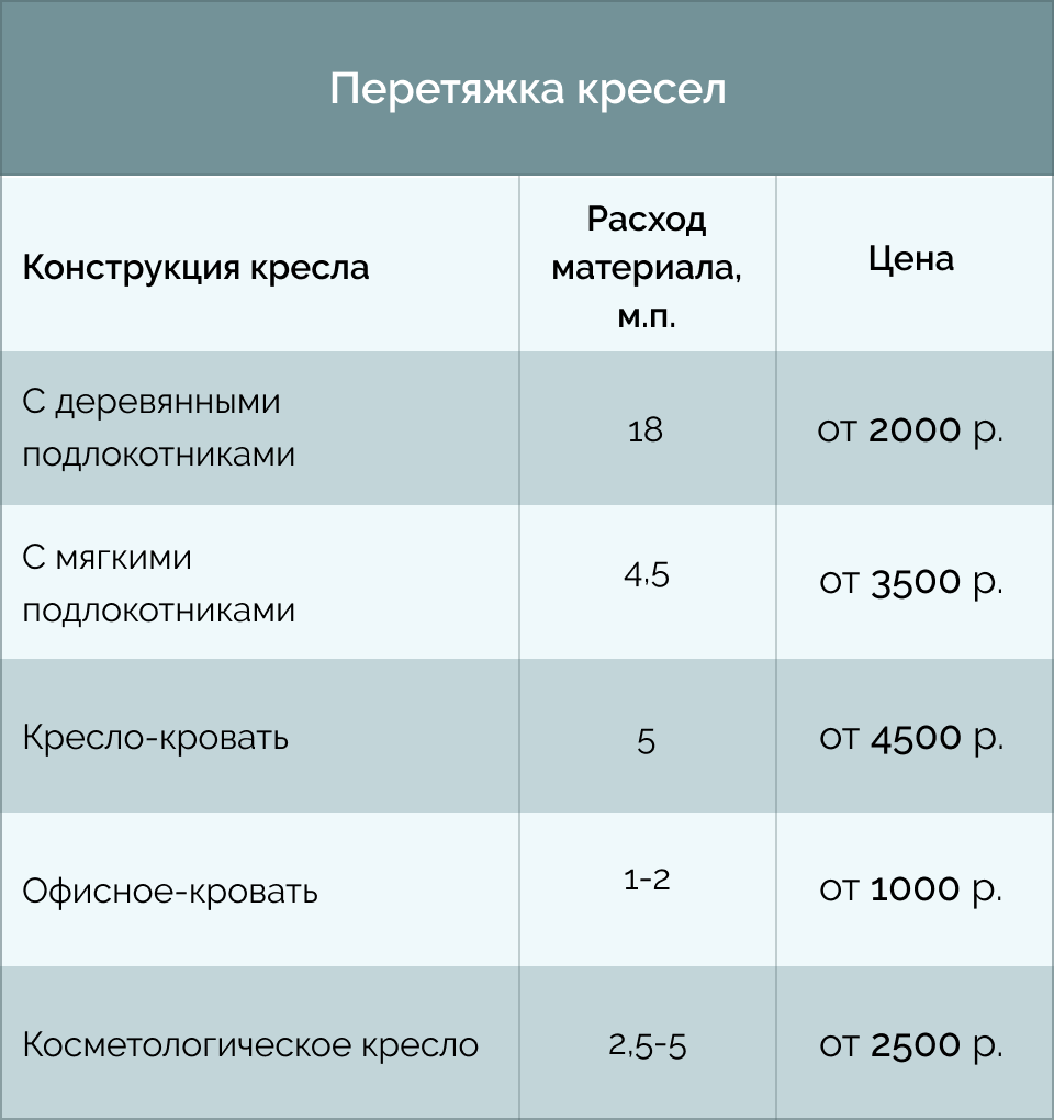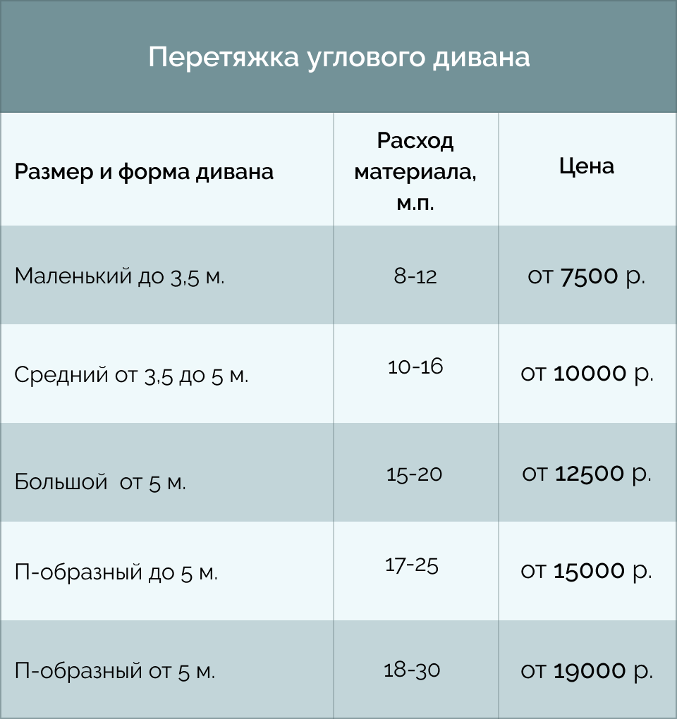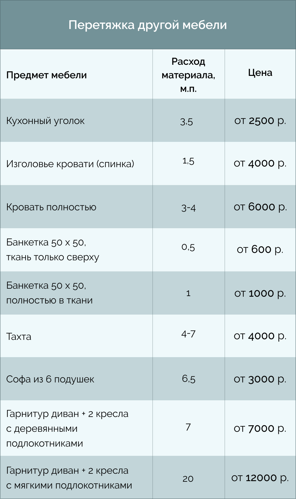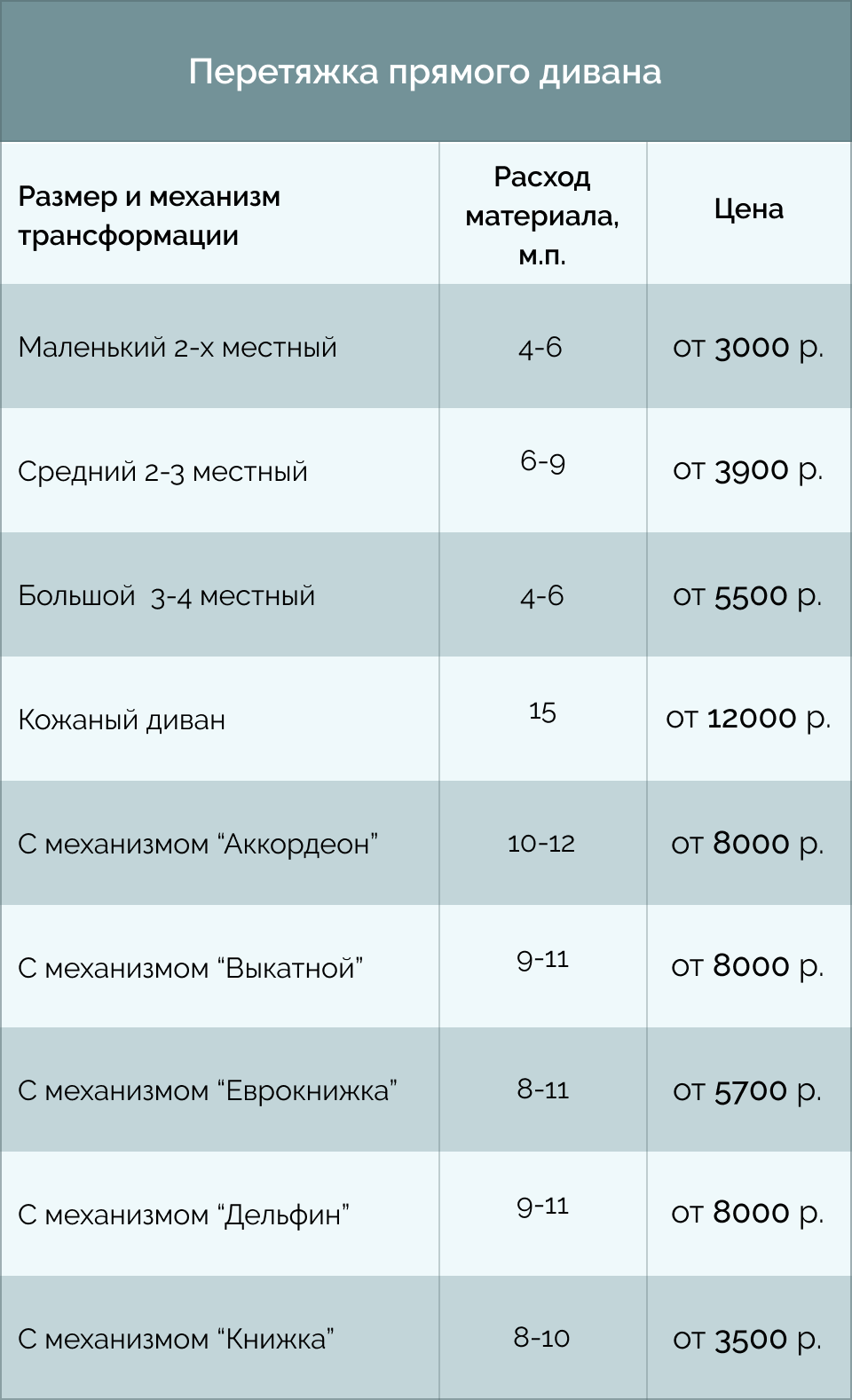 Вызов мастера является бесплатным и позволяет определить точную сумму заказа после визуального осмотра. За 10 минут мастер на месте рассчитает стоимость, а также предоставит подробную смету и каталоги с образцами обивочных материалов.